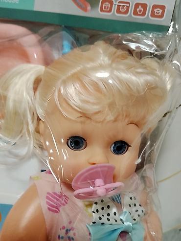 - Кукла-малышка с голубыми глазами и светлыми волосами, в розовом комбинезоне с бантиком; в комплекте пустышка.