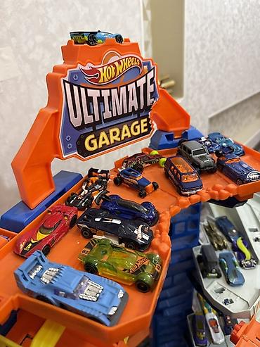 - Большой многоуровневый гараж Hot Wheels Ultimate Garage с парковочными платформами, спусками и съездами. На вершине — фирменная вывеска, внутри — лифты и рампы для заездов и хранения.