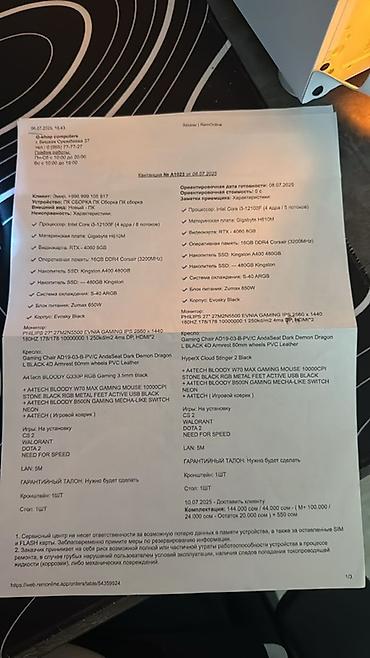 Подойдёт для 1440p гейминга: высокие/ультра настройки в современных проектах, стабильный FPS в киберспортивных играх, быстрый 180Гц 4К монитор для соревновательной игры. Тихая система охлаждения с адресной подсветкой, быстрый запуск ОС и игр с SSD, удобная гарнитура и полный набор периферии. Документы по сборке и спецификация прилагаются на фото.