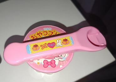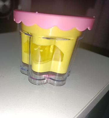 - Комплектация: прозрачный контейнер-стаканчик в форме пудинга с розовой крышкой; внутренняя «начинка» желтого цвета; розовая ложечка/лопатка с наклейками медвежонка и кролика.