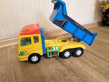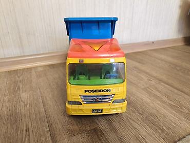 - Большой яркий самосвал Poseidon: кабина жёлто‑оранжевая, кузов синий с наклейками, поднимается на гидроподъёмнике. Шесть колёс, кабина с прозрачными стёклами и рулём, декоративная панель с рычажками сбоку.