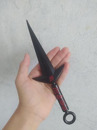 Игрушечный кунай из аниме «Наруто» выполнен в чёрном цвете с красными акцентами на рукояти. На рукояти нанесены иероглифы, а также символ клана Учиха. Кунай имеет круглое отверстие на конце рукояти, что позволяет легко держать его или подвешивать. Этот кунай станет отличным дополнением для коллекции фанатов «Наруто», косплея или просто для игры. Он упакован в прозрачную блистерную упаковку с изображением персонажей аниме на заднем фоне.Предназначен для коллекционирования, косплея или ролевых игр.