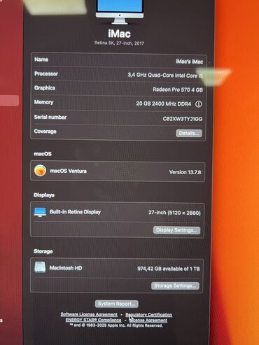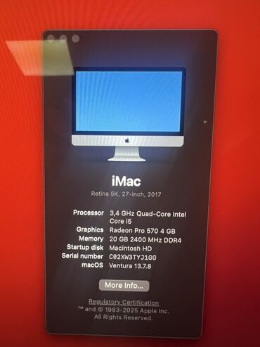 Большой, красивый все-в-одном-компутор iMac 27 дюймов, модель 2017 года. Intel core i5, 20 гигабайт оперативной памяти, два жесткий диска: SSD 1TB и HDD 500GB. Есть небольшая трещинка на стекле в верхнем левом углу, появилась в процессе апгрейда (руки кривые), практически незаметна, на ходовые качества не влияет