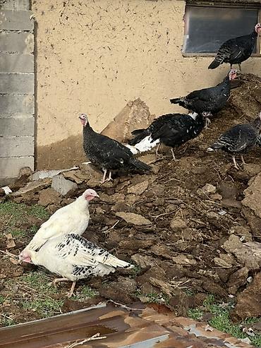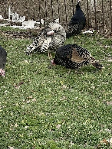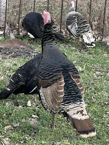 Предлагаются индейки, представленные в различных окрасах оперения, включая черные, бело-черные и белые особи. Птицы имеют характерное телосложение и яркие красные кожные наросты на голове и шее. Оперение у некоторых особей глянцевое черное, у других — смешанное, с белыми и коричневыми перьями, особенно на крыльях и хвосте. Индейки содержатся на свежем воздухе, на травянистой территории, что способствует их здоровому развитию. Это отличный выбор для разведения в домашних условиях или для получения свежего мяса.