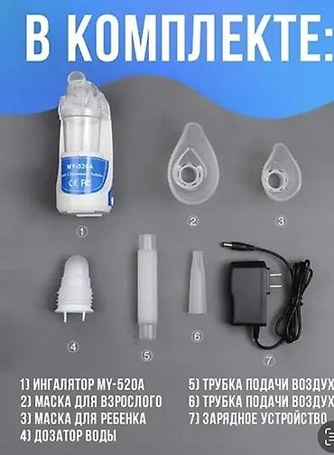 Ингалятор 1шт, маска для взрослого 1шт, маска для ребенка 1шт, дозатор воды 1шт, трубка подачи воздуха 2шт, зарядное устройство 1шт