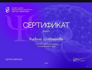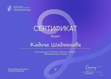 Меня зовут Кадича . Я практикующий психолог , с высшим психологическим и педагогическим образованием . Проходила курсы :