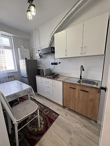 - Отдельная кухня с гарнитуром: верхние и нижние шкафы, рабочая столешница, мойка с сушкой, вытяжка, настенное газовое оборудование, холодильник, микроволновая печь, электрическая плита-панель, обеденный стол со стульями.