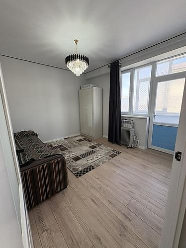 - Комната квадратной формы, потолочная люстра, большой ковер, диван, шкаф для хранения, выход на застекленную лоджию/балкон.