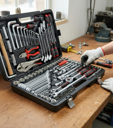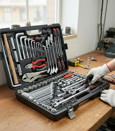 Набор инструментов в черном пластиковом кейсе включает комбинированные гаечные ключи, торцевые головки, трещотки и удлинители. В комплект также входит аккумуляторная дрель-шуруповерт красного цвета...