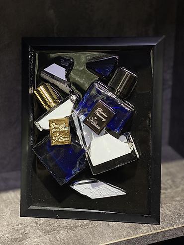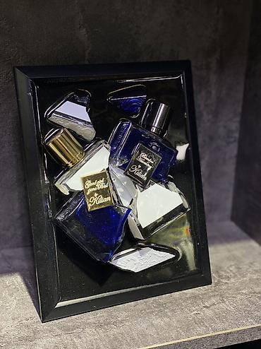 Композиция выполнена из элементов флаконов Good Girl Gone Bad by Kilian и Bamboo Harmony by Kilian, аккуратно закреплённых в глубокой чёрной рамке. Синие стеклянные детали и золотые элементы создают эффект роскоши и глубины.