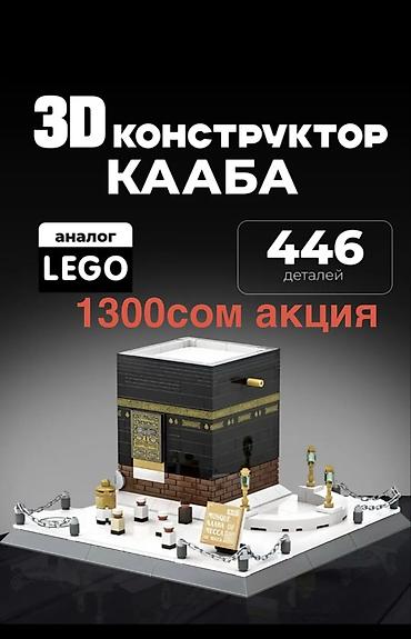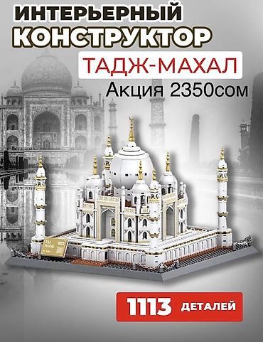 - Тадж-Махал — 1113 деталей. Детализированная модель с куполами и минаретами, табличкой и подиумом для выставки. Формует реалистичную архитектуру с декоративными вставками золотого цвета. Акция 2350 сом (указано на изображении).