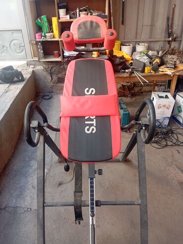 Инверсионный стол для растяжки позвоночника и релаксации мышц - Модель с мягким анатомическим столом и подголовником, цвет черно‑красный, надпись SPORTS. - Прочная складная рама из металла. - Боль...
