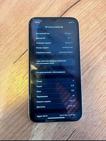 - Экран “Об этом устройстве” с деталями: iPhone 11, 128 ГБ памяти, серийный номер и другая системная информация.