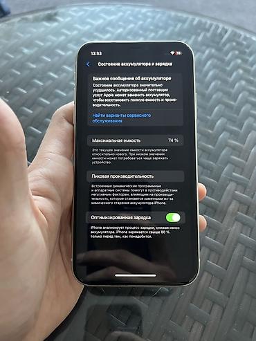- Аккумулятор: максимальная ёмкость 74% (на экране отображается уведомление о необходимости сервисной замены для восстановления полной ёмкости и производительности).