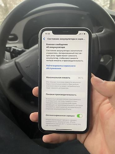- Аккумулятор: в разделе «Состояние аккумулятора» отображается уведомление о необходимости обслуживания, максимальная емкость — 74%.