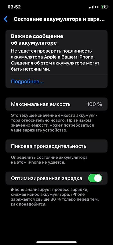 - Аккумулятор: в разделе «Состояние аккумулятора» отображается сообщение о невозможности проверки подлинности аккумулятора Apple; максимальная емкость указана как 100%, «Оптимизированная зарядка» включена