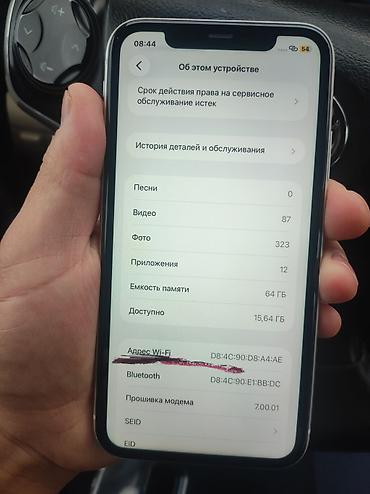 На фото показан текущий интерфейс iOS, уровень заряда и раздел “Об этом устройстве” с объёмом памяти 64 ГБ. Корпус — стекло с логотипом Apple, модуль из двух камер с вспышкой. Отличный выбор для фото/видео, игр и повседневных задач.