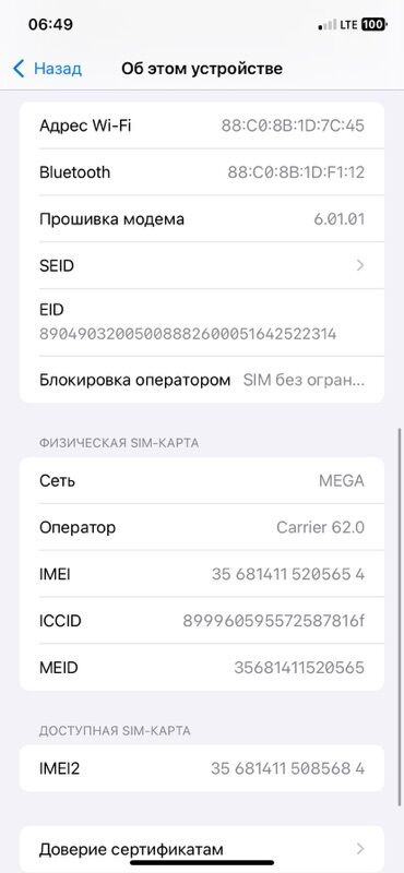 - Две SIM: физическая + eSIM (показаны IMEI и IMEI2)
