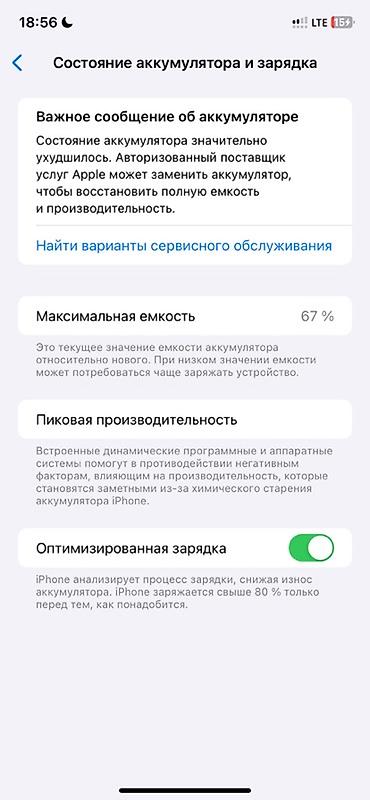 Батарея: в разделе «Состояние аккумулятора» отображается сообщение о необходимости обслуживания, максимальная ёмкость — 67% (скриншот прилагается).