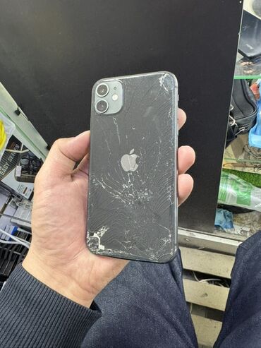 IPhone 11, черный цвет, корпус из стекла и алюминия. - Дисплей 6.1" Liquid Retina (True Tone, Haptic Touch); на экране видны вертикальные полосы и трещины. - Двойная камера 12 Мп (широкоугольна...