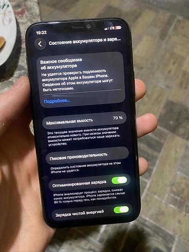 - В настройках аккумулятора отображается сообщение: «Не удаётся проверить подлинность аккумулятора Apple…», максимальная ёмкость — 79%. Включены «Оптимизированная зарядка» и «Зарядка чистой энергией»