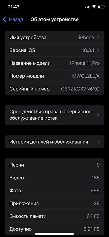IPhone 11 Pro Max, 64 ГБ, цвет Space Gray. АКБ:91 Характеристики и детали: - Модель: iPhone 11 Pro Max (номер модели MWGJ2LL/A) - iOS: версия 18.5 - Память: 64 ГБ, доступно около 50,33 ГБ - Экран:...