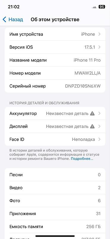 IPhone 11 Pro, 256 ГБ - Цвет: серебристый - Модель: iPhone 11 Pro (MWAU2LL/A) - Версия iOS на фото: 18.6.2 - Экран с вырезом под Face ID - Тройная основная камера с вспышкой, широкоугольный, ультр...