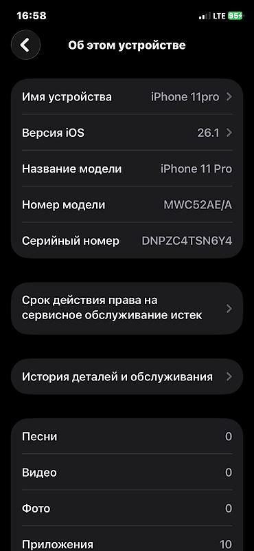 IPhone 11 Pro, 256 ГБ Характеристики по фото экрана: - Модель: iPhone 11 Pro (номер модели MW9G2LL/A) - Память: 256 ГБ (доступно ~240,93 ГБ) - Версия iOS: 26.2 - Максимальная ёмкость аккумулятора:...