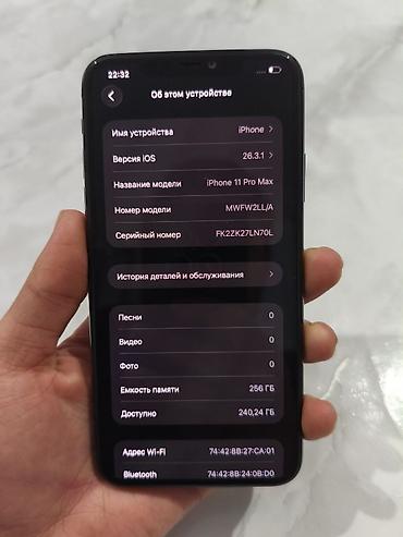 IPhone 11 Pro Max, 256 ГБ, цвет Space Gray. Память 256 ГБ Аккумулятор : 89% Состояние отличное Работает без нареканий Трутон,фейс на месте Доставка по всему КР 🇰🇬
