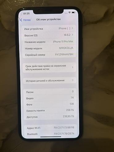 - Экранные сведения «Об этом устройстве» с моделью iPhone 11 Pro Max, серийным номером и объёмом 256 ГБ
