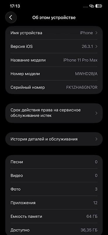 - Экран «Об устройстве» и раздел «История деталей и обслуживания» доступны для проверки