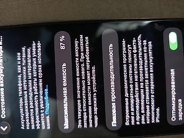 - Аккумулятор: максимальная ёмкость 87% (скрин в разделе «Состояние аккумулятора»).
