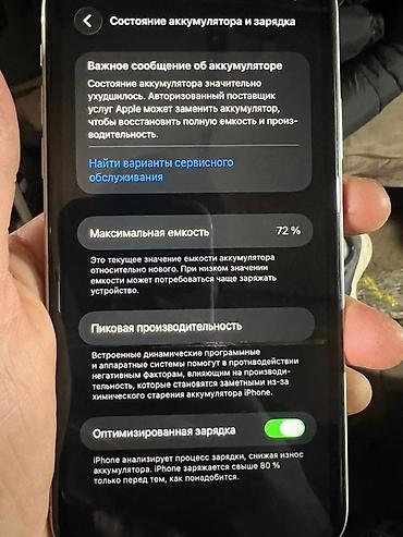 - Аккумулятор: в разделе «Состояние аккумулятора» отображается максимальная ёмкость 72%, активна «Оптимизированная зарядка».