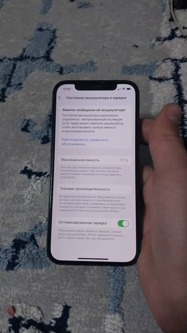 - Батарея: максимальная емкость 77%, включена оптимизированная зарядка.