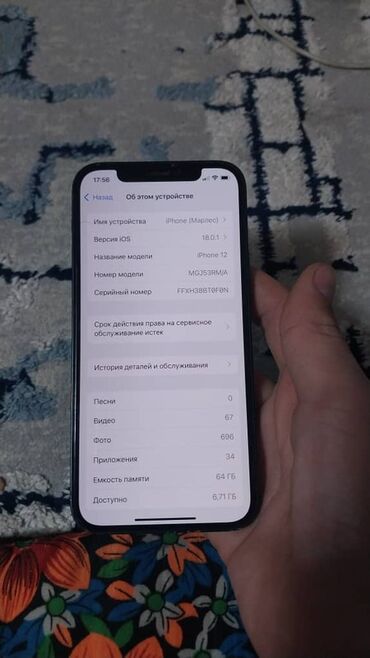 - На скриншоте “Об этом устройстве”: модель iPhone 12 (номер модели MGJ53RM/A), iOS 18.0.1.