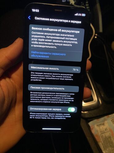 - Аккумулятор: максимальная емкость 79% (в настройках отображается уведомление о необходимости сервисной замены для восстановления полной емкости и производительности). Включена оптимизированная зарядка