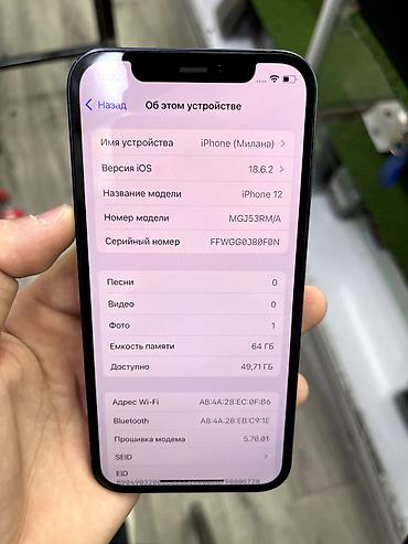 IPhone 12, синий цвет Память : 64 ГБ Аккумулятор 🔋 78% (родной,оригинал) Телефон не вскрытый ,все родное Состояние самолет ✈️ По корпусу в идеале Обмен не предлагать или на обмен дороже