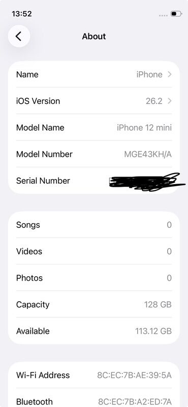 В комплекте стандартные системные приложения, чистый экран «Обо устройстве» на скриншоте. Отличный выбор для тех, кому нужен производительный iPhone в удобном мини‑формате.