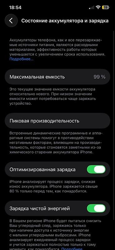 - Аккумулятор: максимальная ёмкость 99%, пикова́я производительность поддерживается; включены «Оптимизированная зарядка» и «Зарядка чистой энергией»