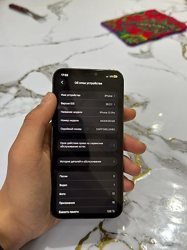 Телефон на русской локализации; в меню «Об этом устройстве» указана модель iPhone 12 Pro, номер модели MGMK3KN/A, объём памяти 128 ГБ. True Tone и Night Shift работают, яркость регулируется корректно. На экране блокировки отображается дата и время, связь LTE.