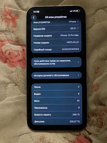 - Модель: iPhone 12 Pro Max (Model No. MGCL3LL/A), серийный номер отображён на фото в разделе “Об этом устройстве”