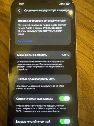 - В разделе “Состояние аккумулятора”: максимальная ёмкость отображается 100%; присутствует системное уведомление о невозможности проверить подлинность аккумулятора, оценка пиковой производительности недоступна