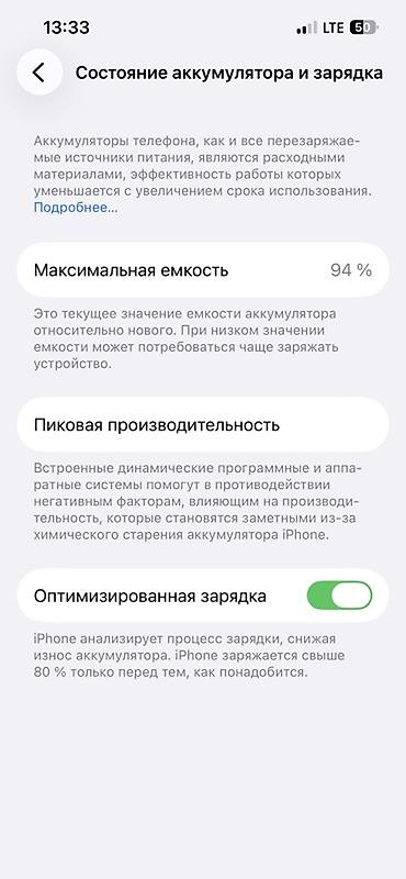 - Аккумулятор: максимальная ёмкость 94%, включена функция «Оптимизированная зарядка»