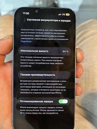 - Аккумулятор: максимальная ёмкость 84%, включена «Оптимизированная зарядка»