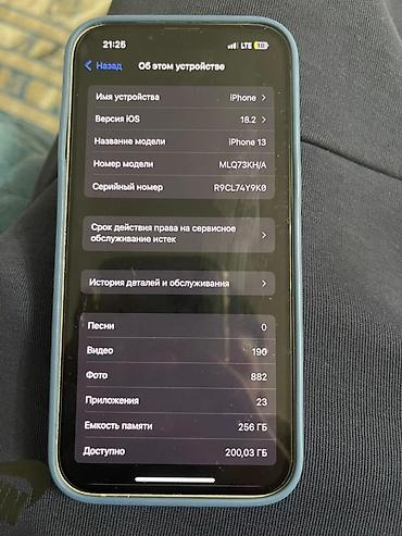- На экране устройства видно: версия iOS 18.2, объём 256 ГБ, серийный номер и модель