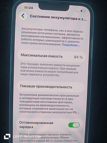 - Состояние аккумулятора по системе: максимальная емкость 84%, пиковая производительность поддерживается, оптимизированная зарядка включена.
