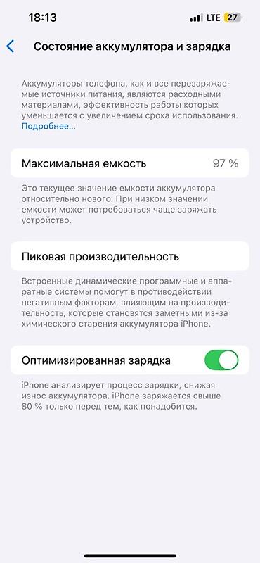 - На скриншоте «Состояние аккумулятора» максимальная емкость 97%, включена «Оптимизированная зарядка».