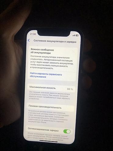 - Состояние аккумулятора по настройкам: максимальная ёмкость 66%; отображается системное сообщение о необходимости обслуживания аккумулятора.