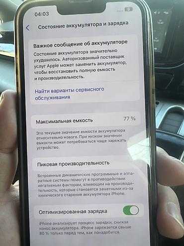 - Аккумулятор: в разделе “Состояние аккумулятора” отображается сообщение о необходимости сервисной замены; максимальная ёмкость — 77%