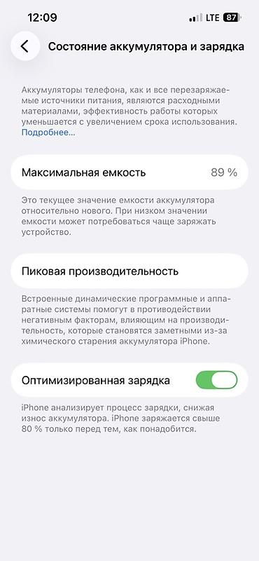 - Аккумулятор: максимальная ёмкость 89% (скриншот «Состояние аккумулятора»), включена «Оптимизированная зарядка»